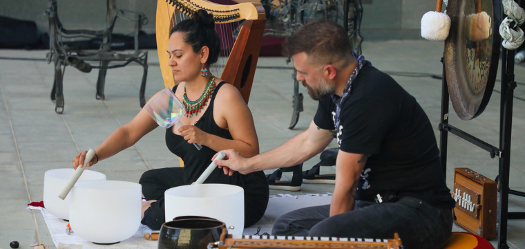 Participate in a restorative journey through sound with Pamela Martinez, musician, and educator. This group meditation utilizes the vibrational power of sound to hold space for a time to tune into our higher selves while allowing the body to rest and digest. When we come together, the field of gentle replenishment gets propagated as we build a community that heals together, grows together, creates together. Participants of the Sound Bath can expect to be lulled into deep relaxation using the sounds of singing bowls, gong, tuning forks, vocals, and other sound sources to provide a meditative and healing environment while seated on the ground or more traditionally lying down on the ground. Please bring a mat/blanket and water. Class takes place at the Amphitheater or in the classrooms during cold-weather days; plan to come 15 minutes before event to get directions from Admissions Kiosk at the main entrance.
