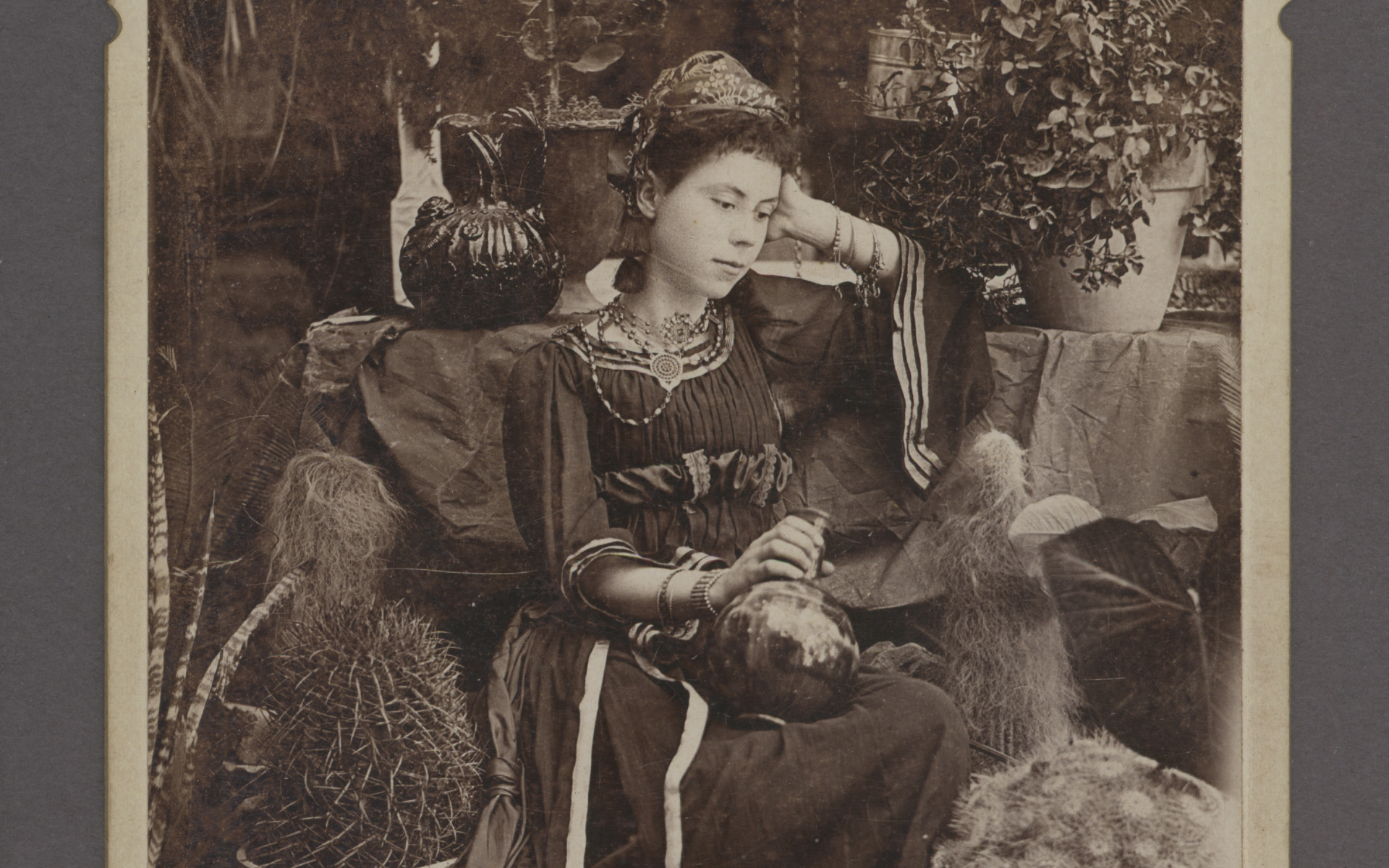 Image: [Young woman holding vase surrounded by cactus and plants] ca. 1890s